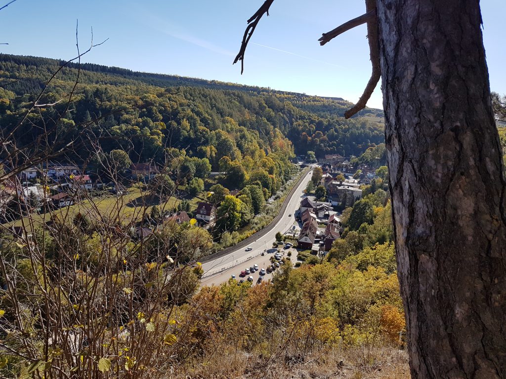 Der Schornsteinberg (HWN 089) hat eine Bank, die zu einer Rast einläd. Von hier hat man einen sehr schönen Blick auf Rübeland mit der Eisenbahn sowie den gegenüberliegenden Aussichtspunkt „Hoher Kleef“! Diesen Stempel konnten wir leider nicht holen.
