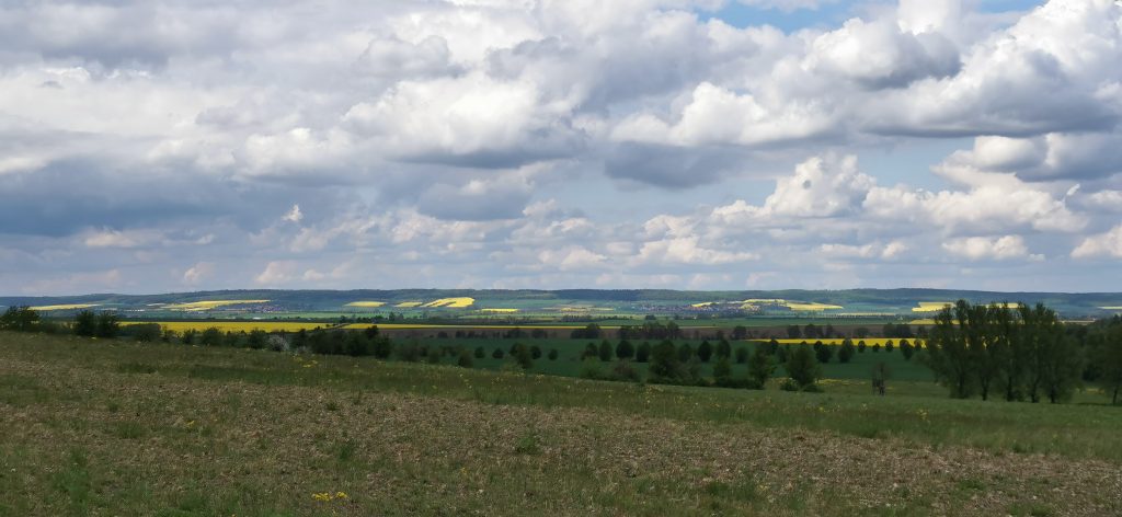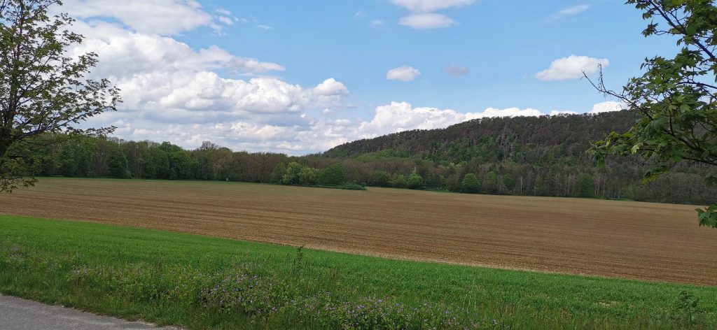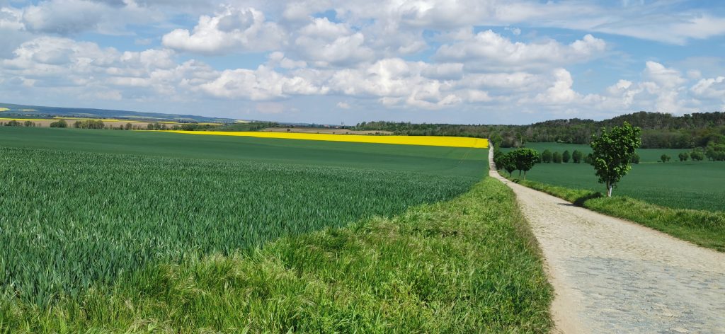 Unser Weg führte uns aus Langenstein heraus, dann bogen wir rechts ab und liefen weiter in Richtung Halberstadt, den Dom kann man im Hintergrund erkennen.