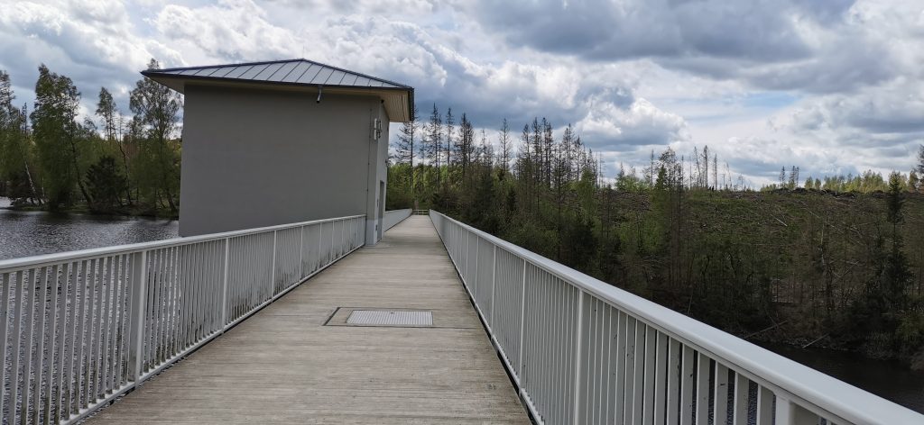 Wir liefen ca. 1,6 km bis zur nächste Stempelstelle Trautenstein (HWN 56). Von hier konnte man auf die Rappbode-Vorsperre schauen. Wir liefen den Weg zurück über die Rappbode-Vorsperre vorbei an der Schutzhütte und den schmalen Weg hinauf und wieder hinunter bis uns der Weg versperrt war. Baumfällarbeiten. Wir hörten die Arbeiter, gingen den Weg jedoch vorsichtig weiter. Ein Glück war die Absperrung nicht sehr lang. Es war schon ein komisches Gefühl und wir waren froh, als wir durch waren.