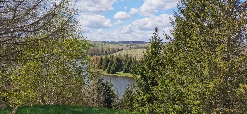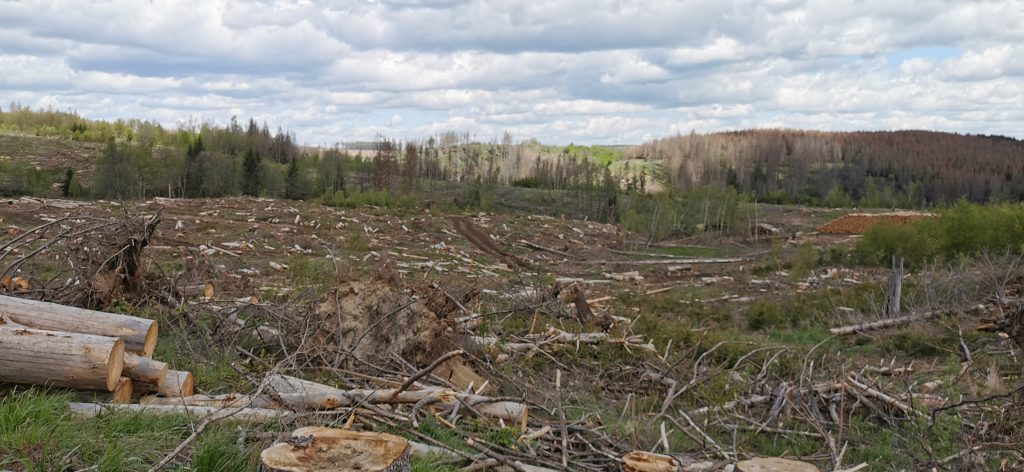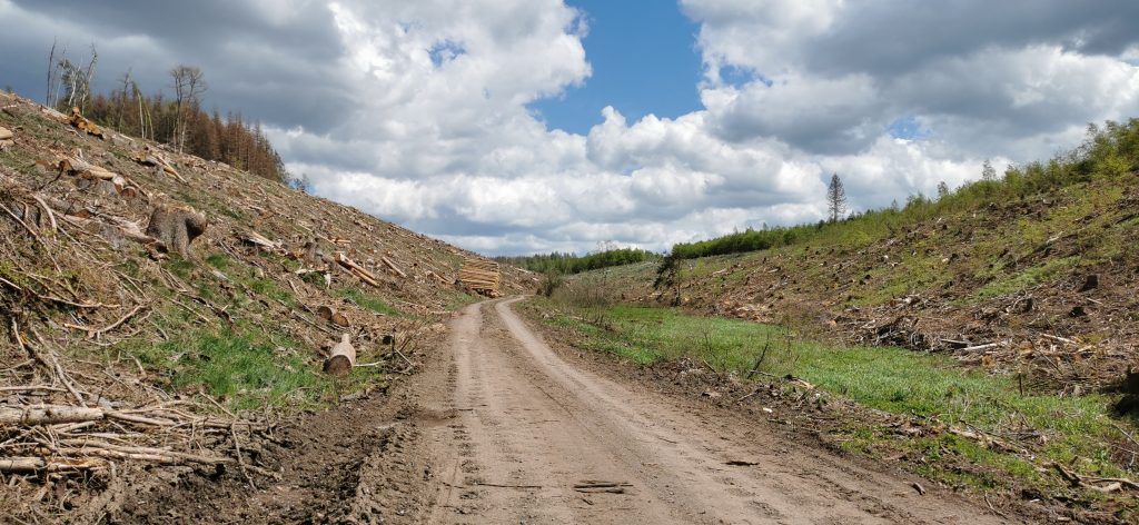 Wir genossen das Grün dieser Aue und liefen langsam weiter. Unser Weg führte uns nun wieder durch die abgeholzten Gebiete.