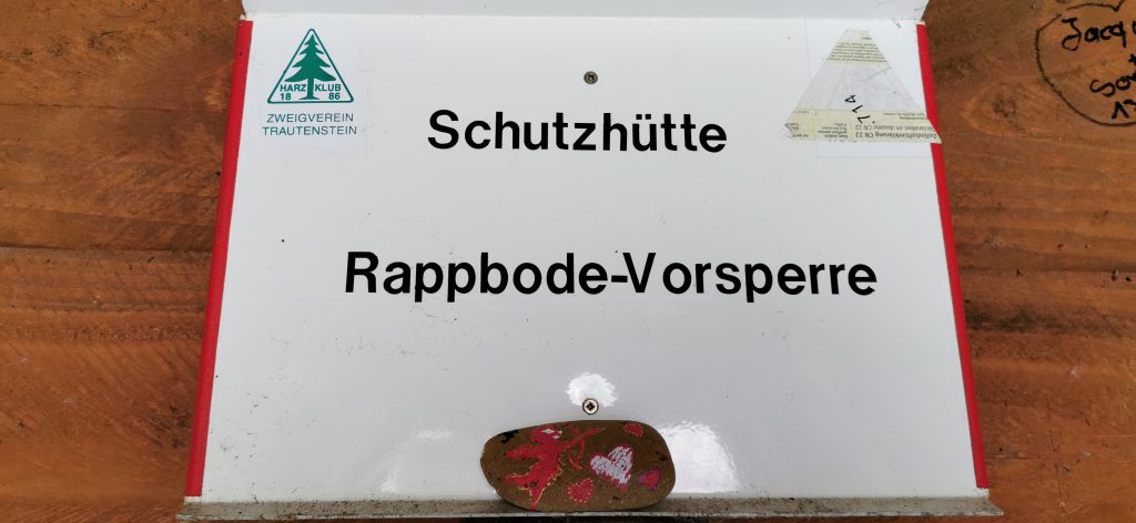 Nach einigen hundert Metern kam die nächste Schutzhütte, in dieser machten wir kurz Rast. Hier hatte jemand einen Harz-Stein ausgelegt, dieser sollte uns ein wenig begleiten.
